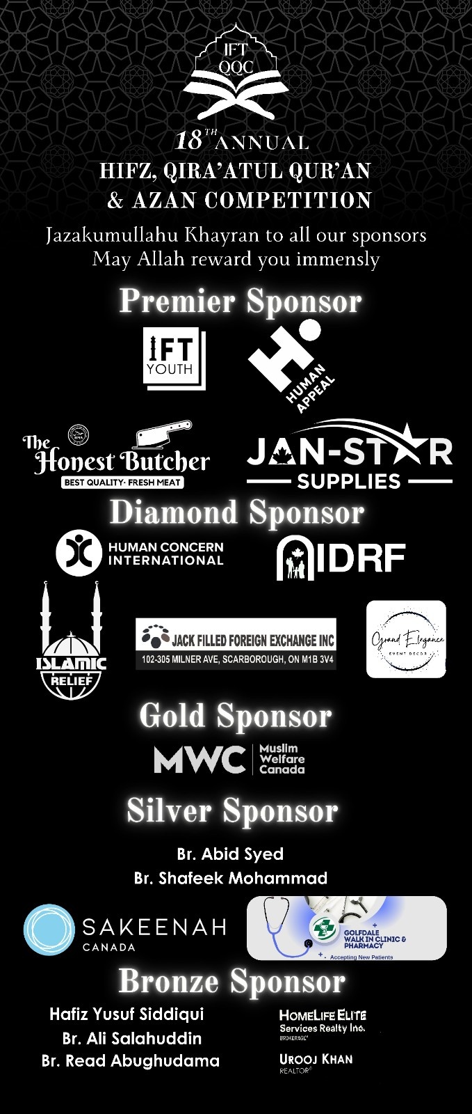 The Hifz, Azaan, and Qiraatul Quran Competition is made possible by your generous donations, which go towards subsidizing the costs associated with this event. May Allah (SWT) reward you abundantly for your generosity.